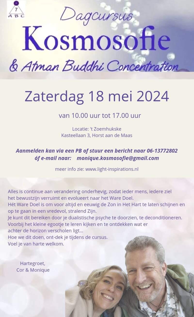 Aanmelden kan via een PB of stuur een bericht via WhatsApp op 06 13772802 of een mail naar monique.kosmosofie@gmail.com